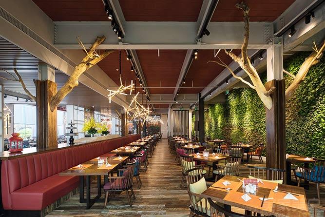 自然清爽的绿墙,让人瞬间感觉醒神。简约而抽象的巨型树枝错落有致,方便引领宾客进入主用餐区。同时,用餐区的柚木地板也有所区分,用餐区地板主要以柚木地板和大理石区分不同的用餐体验,在维持整体开放无碍的空间感之际,并让宾客行走其间不会无所适从。