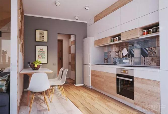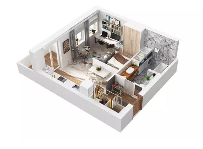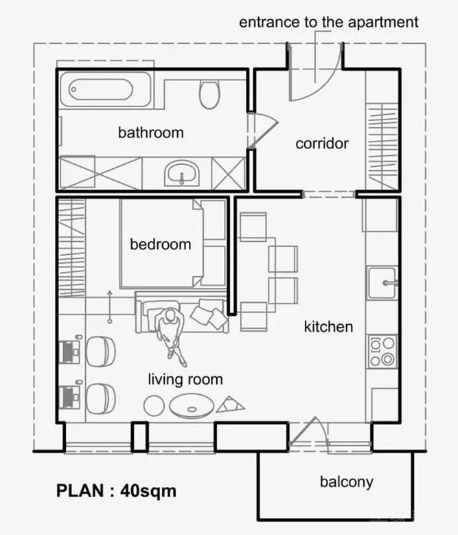 40平米的面积,按部就班的极简风格,将基础功能全部妥善安置。用脚下的地板和瓷砖划分区域,自然舒适。阳台和窗在公寓的一侧,客厅沙发的背后是卧室,用一面玻璃隔开。这样,除了卫生间以外,每一个房间都有足够的自然采光。