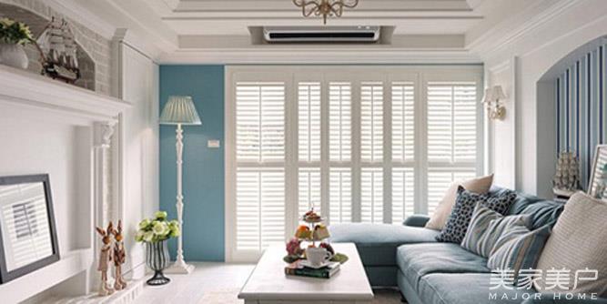 整体就以蓝白色调装饰起来的客厅,清澈无瑕,诠释着人们对蓝天白云,碧海银沙的无尽渴望。整体上以白色为色调的墙面配上蓝色的布艺沙发,蓝白色调的搭配,如同迎面吹来了一股清新自然的海洋之风。客厅装上白色的百叶窗,户外光线洒入室内时,更显居家高雅气氛。