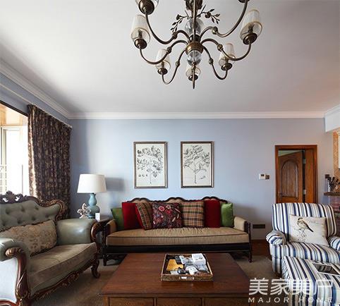 点评:客厅作为待客区域,一般要求简洁明快,同时装修较其它空间要更明快光鲜,通常使用大量的石材和木饰面装饰;美国人喜欢有历史感的东西,这不仅反映在软装摆件上对仿古艺术品的喜爱,同时也反映在装修上对仿古铁艺吊灯,素雅布艺沙发的偏爱和对各种仿旧工艺的追求上。总体而言,美式田园风格的客厅是宽敞而富有历史气息的。