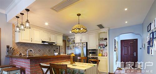 点评:美式风格餐厅在装饰上也有很多讲究,如喜好仿古面的墙砖、橱具门板喜好用实木门扇或是白色模压门扇仿木纹色。另外,厨房门也喜欢配置实木门等。