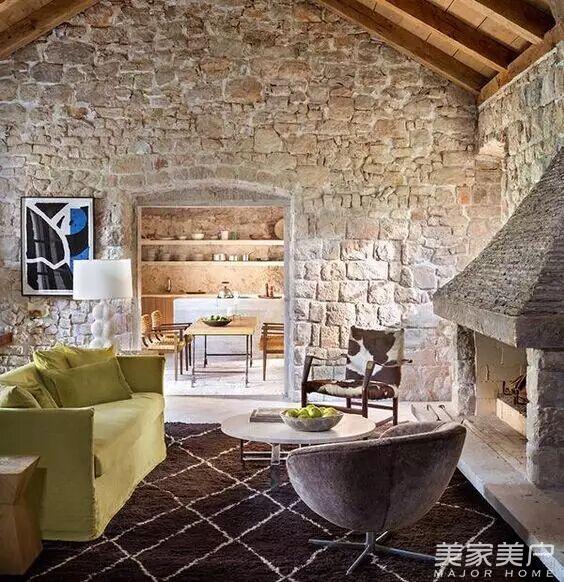 石头墙壁的自然质朴,与家具的精致细腻相互映衬。色彩也变得更加艳丽动人,形成一种不同寻常的氛围。