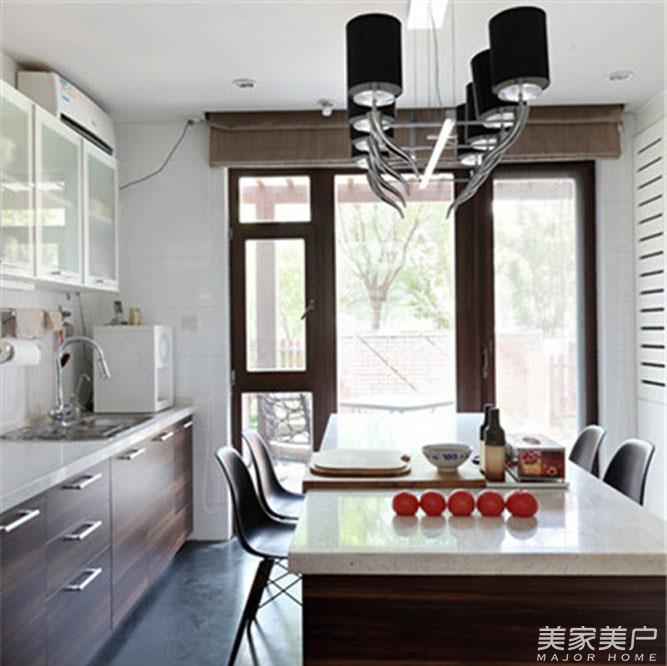 很多小户型空间除了把餐厅与起居室设置在一起之外,把餐桌摆放到厨房里面也未免不是另一种方法。搭配上天花板的老式吊灯,暗黄的灯光落在用餐空间里面,朴素、怀旧的氛围更让用餐变得浪漫、动人。