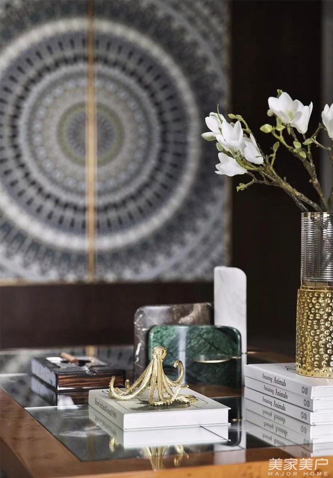 在整体明亮简约的浅色大空间中,过厅处一面棕色原木墙超脱出来,赋予了空间朗朗气度之美,设计师顺势而为,只以巨幅花纹装饰画装点其上,层层发散状的圆环花纹,神秘而富有张力,让空间更显气韵生动。