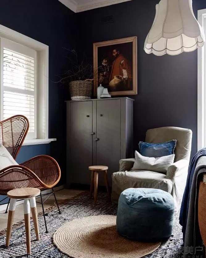卧室和其他空间很不一样,墙面被戏剧性的刷成了蓝墨色,没有什么特殊的材料,多乐士的一款涂漆而已。穿过明亮的客厅和走廊,你可能会觉得主人实在有点喜怒无常。但你不得不感叹设计师对于空间和色彩的把握。