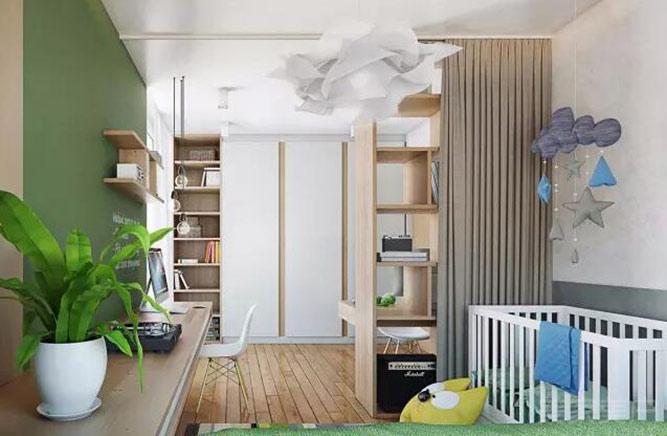 80平米的面积,每个房间都有多种鲜艳的颜色搭配,适合家里不大的孩子。木质的材料用于缓和视觉上的刺激。儿童床放置在最里端安静免打扰,和工作室放在一起,通过阳台将这里和主卧连接,可以及时的照顾孩子。极简的装饰风格符合当今的流行趋势,不易过时。