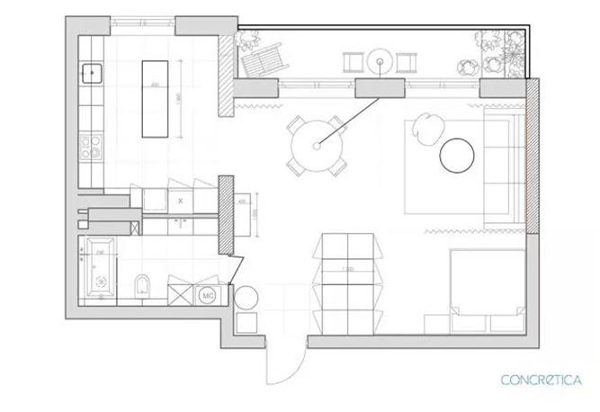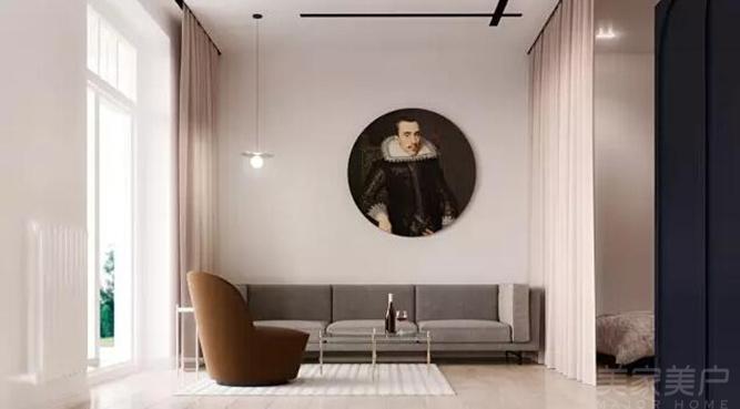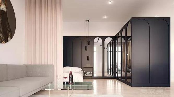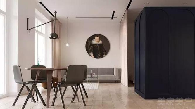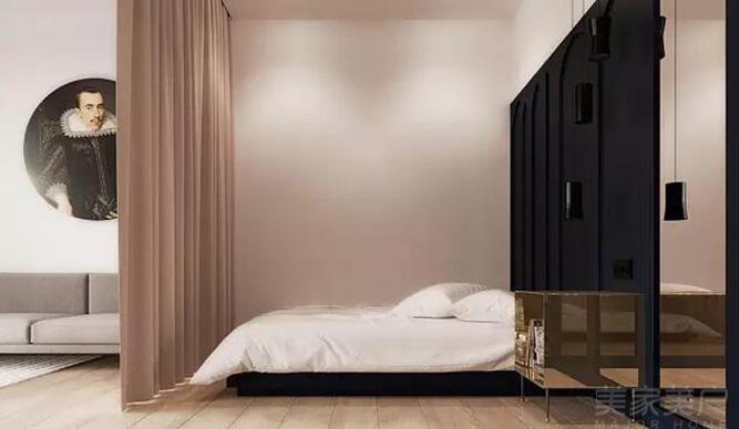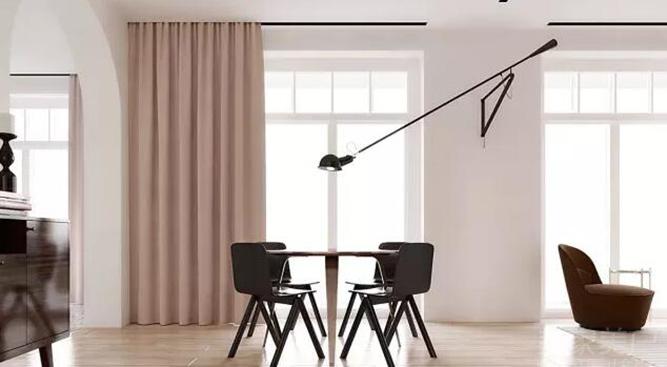 空间布局上设计师显然花了心思。开放式的客厅与厨房餐厅形成了一体化格局,使整个空间显得更为宽敞,通过别致凹造型的厨房门洞,显得十分有趣。轻柔的帘幕阻隔了客厅与卧室,让其成为了两个独立的空间。由大大的落地窗自然散发出来的阳光使得整个空间明亮温暖。