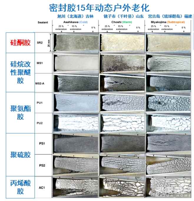 紫外线能力接近400kJ/mol,碳氧键、碳碳键、碳氮键、碳硫键、硫硫键这些单键的键能普遍低于400kJ/mol,很多低于300kJ/mol,很容易在紫外线的照射下发生断裂,而硅氧键键能高于440kJ/mol,高于紫外线能量,因此耐紫外老化性能好。15 年动态户外老化试验也印证了其在各类密封胶中的耐久性优势,成为建筑密封领域的首选材料。