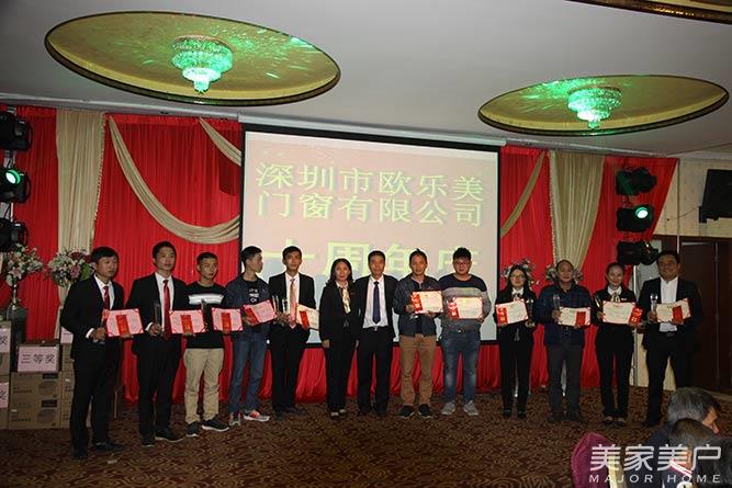 16日晚在深圳龙岗合兴酒店举行的欧乐美(鸿辉)门窗10周年庆答谢晚宴上,欧乐美门窗的经销商、供应商,以及全体家人们汇聚一堂,见证着属于欧乐美门窗的荣耀时刻。欧乐美门窗总经理曾鸿辉向优秀供应商颁发了荣誉牌。欧乐美门窗总经理曾鸿辉、副总经理谌莲共同为2016年度优秀员工与“功勋奖”获得者颁发了荣誉牌及奖金。晚宴上,穿插着丰富多彩的文艺节目和抽奖环节,赢得现场阵阵掌声,不时将晚宴推向高潮。最后,晚宴在欧乐美门窗团队齐唱“明天会更好”的歌声中圆满落幕。