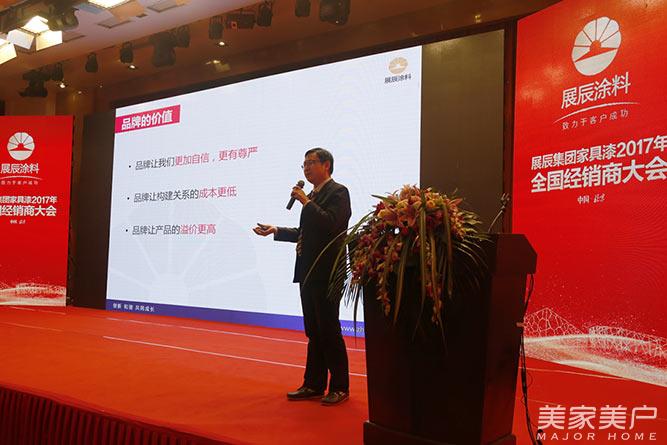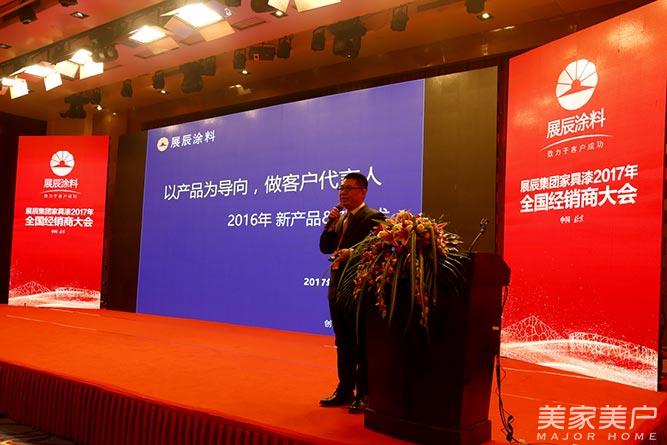 展辰集团品牌总监蒋健做《品牌展辰之路》的主题演讲,介绍展辰集团的品牌形象设计、品牌主题策划、品牌媒介传播,展望2017年,UV及水性漆将达到一个全新的高度,展辰在市场中的品牌影响力日渐显著。2017年展辰集团品牌新使命,进一步塑造展辰品牌高度,强化在UV及水性领域的优势,辅助展辰家具漆产品推广。