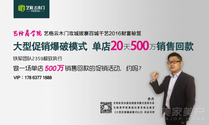 战略人才储备,协作营销团队。我们携手专业国际导师团队,先进的教学理念和教学方式,培训团队的管理能力、运营能力、服务能力。我们导入专业的营销团队,定制家居加盟连锁盈利模式资深专家、艺格商学院渠道运营系统总教官、《大型促销爆破模式6.0》实战导师——李丹。定制家居行业加盟连锁盈利模式专家、艺格云木门《Y7终端运营系统》创始人、艺格商学院高级讲师——赵曰栋,全面协助合作伙伴提高学习能力、创新能力来创造理想业绩。