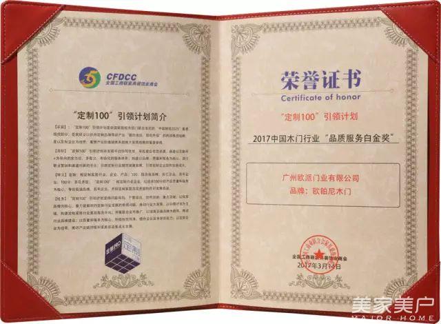 恰逢3.15消费权益日之际,木门产品质量也成为本届展会的重要话题之一。欧铂尼木门一直将质量问题视为企业的重中之重,这在业内一直有口皆碑。因此,在由全国工商联家具装饰商会举办的“定制100”引领计划奖项评选中,欧铂尼木门荣膺2017中国木门行业“品质服务白金奖”。