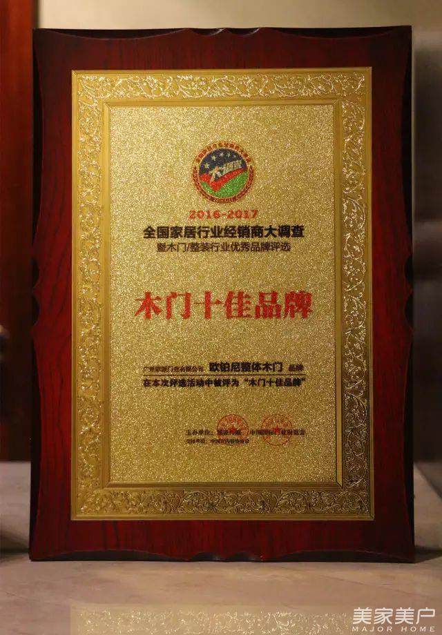 另外,在2016-2017全国家居行业经销商大调查暨木门/整木家装行业优秀品牌评比活动颁奖典礼上,欧铂尼木门荣获“木门十佳品牌”奖项。在北京门展大舞台上,一举斩获行业内公认的两项质量大奖,是对欧铂尼木门产品品质与品牌实力的权威见证!