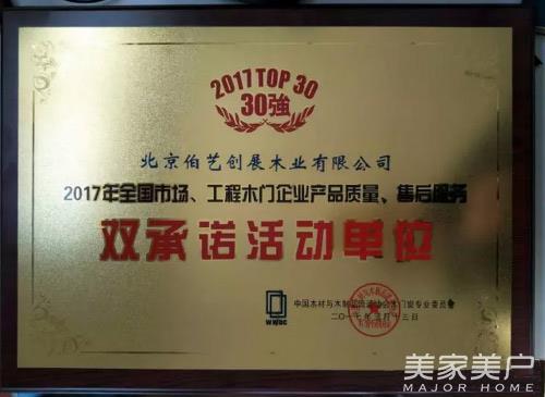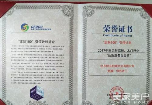 来自北京的伯艺木门,参加中国建博会(上海)同样有备而来,在3月13日荣获由中国木材与木制品流通协会木门窗专业委员会授予的“中国木门30强双承诺活动单位”荣誉称号,并在全国工商联家具装饰业商会主办的“定制100”引领计划之2017中国门业与定制家居发展高峰论坛上,荣获中国定制家居木门行业“品质服务白金奖”。两大奖项的获得,是对伯艺木门过去一年成绩的最好褒奖。可以说,无论是拼品质,还是拼服务,伯艺木门都底气十足,无惧挑战!