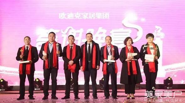在17号晚的答谢宴上,大会共颁发了五项大奖:欧迪克家居集团2016年最佳新锐奖、最佳店面形象奖、最佳服务奖、最佳主动营销奖以及最佳年度销量奖。
