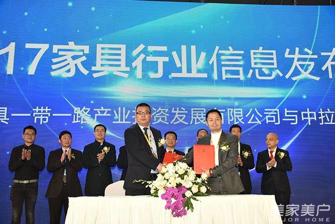 在第37届名家具展第一天的“2017家具行业信息发布会”上,东莞市名家具一带一路产业投资发展有限公司与中拉经贸有限公司签定合作协议,众家联平台正式上线。