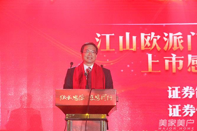 会上,江山欧派门业董事长吴水根发表致辞。他表示,江山欧派门业能够成为木门行业第一家上市A股的企业,离不开大家的信任与支持,江山欧派门业更应该心怀感恩,感谢江山政府对江山欧派门业的支持,感谢江山欧派门业所有同仁们的辛勤付出,感谢社会对欧派的大力支持与认可。未来,江山欧派门业还有很长的路要走,也会不忘初心,更加务实努力。