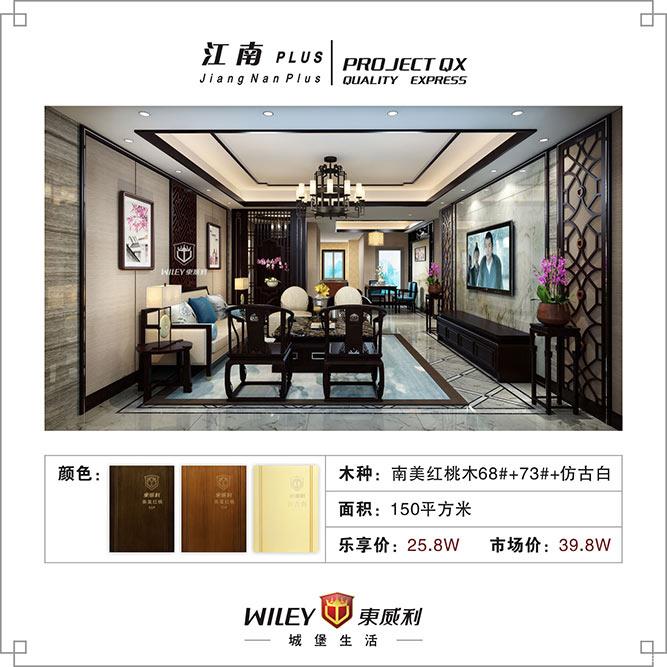 江南传统建筑整体特色的江南地区是著名的鱼米之乡,人民勤劳富足,世称“江南水乡”。这里的人们自古以来临水而居,形成以水道为轴线的分布格局。黑、白、灰三色,是江南水乡传统建筑的主色调,在青山绿水的自然环境中,显得淡雅质朴。江南景色一向为人们所倾倒,她那种典雅而不失庄重、个性而不失沉稳的气质更是动人。江南PLUS采用以上南美红桃木三种木色,充分体现出江南的“小桥流水人家”感觉。