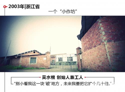2003年,江山欧派正式成立,对于初创企业而言,每一步都不平坦,没有大气的厂房,没有雄厚的资金。由于人手不足,作为公司创始人的吴水根,同时也是一名一线员工,带领员工奋战在一线,只为心中那个梦想——别小看我这一块“破”地方,未来要把它扩个几十倍!在当时的环境下,谁也说不好这是吹牛,还是真的可以预知未来。