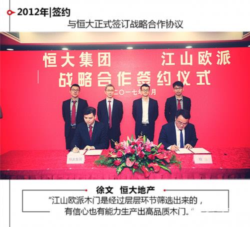 功夫不负有心人,2012年,江山欧派与恒大集团达成战略合作协议,恒大集团副总裁徐文表示,江山欧派是经过层层环节筛选出来的,有信心也有能力生产出高品质的木门。此后,江山欧派的工程精品施工服务体系逐步完善,成为万科等房地产大牌企业的主要木门供应商之一。