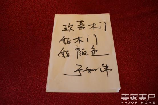 于和伟当场写下:“欧嘉木门,好木门,好颜色”