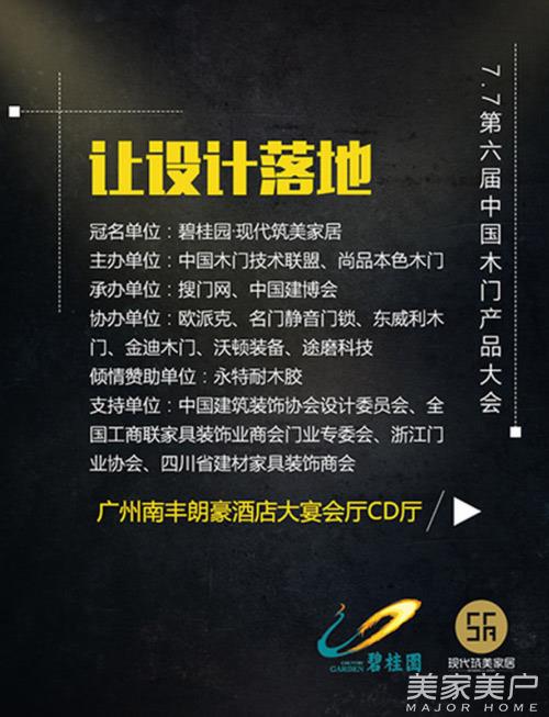 与此同时,由碧桂园·现代筑美家居独家冠名的第六届中国木门产品大会,即将于7月7日在中国建博会(广州)隆重举行,数百家木门企业将展开一场关于“让设计落地”的大讨论。属于碧桂园·现代筑美家居的“大家居时代”,正在加速到来!