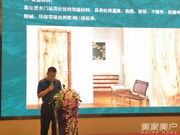 北京霍尔茨木门赵崇联总经理上台发表演讲:“坚持绿色环保,实现可持续发展道路”。以霍尔茨木门为例向大家介绍如何在发展中做到绿色环保,在转型中走上可持续发展道路。