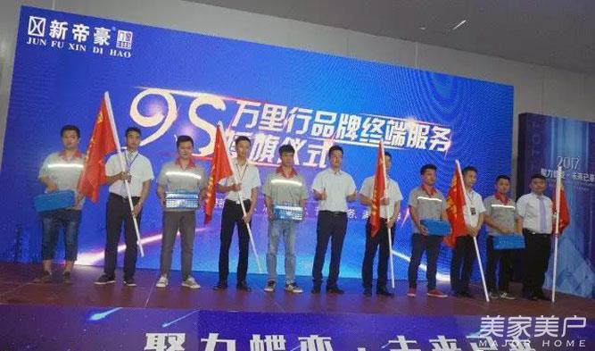 俊福集团董事长和各高管站上台启动9S服务万里行仪式。紧接着金福总经理钟俊伟为营销中心和工程部授予9S服务万里行旗帜。不日后其几人将带着这份荣耀和信念豪迈出征,为全国的经销商家人送去优质的服务。