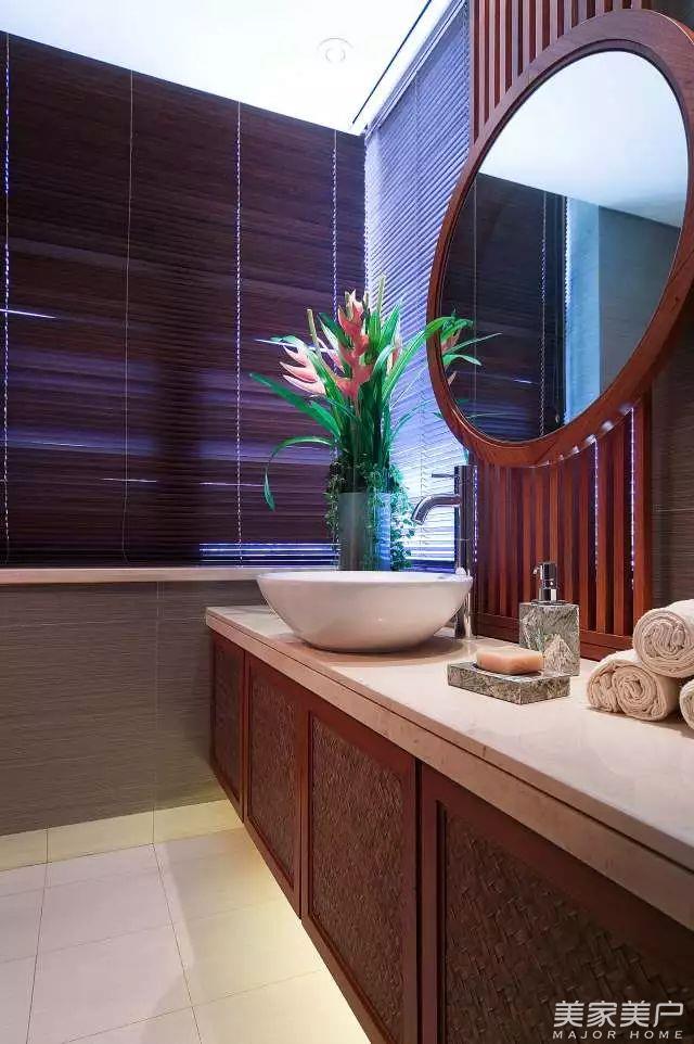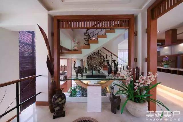 一进客厅,就被这一盏造型独特而又充满南亚风情的灯吸引了。大面积的落地玻璃让南亚风格的客厅显得阳光充足,视野开阔,让你品味那慢生活。