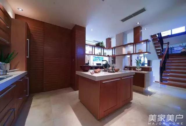 开放式的厨房,明亮、大气,在合理的配置安排下,收纳也如同艺术般的细腻精致,符合现代人追求的家居生活。