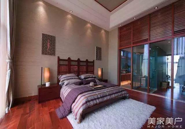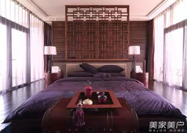 两边是落地玻璃窗,使卧室具有空间感,紫色的窗纱给人一种说不清道不明的神秘。