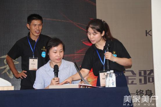 在第一天晚上,专卖安排了经销商卖门演练环节,知名媒体人《门业视界》主编孙黎与金啸总经理来扮演顾客,10名优秀经销商轮番上场,展示其卖门功夫。