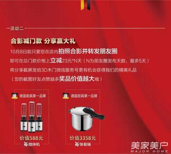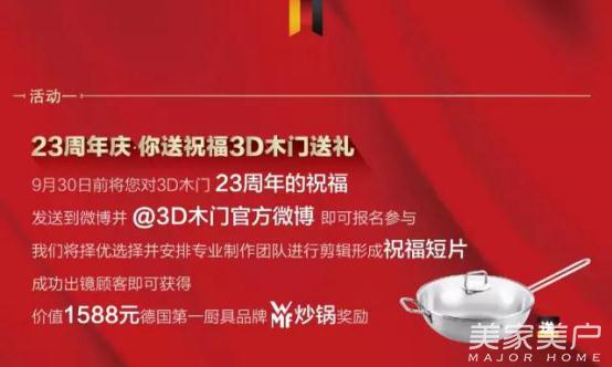 即日起至10月8日在3D木门全国千家店面及3D木门天猫旗舰店即可参与活动,享受优惠。3D木门本次23周年庆活动火爆进行,提前拔得了木门行业十一促销活动的头筹,引爆市场。