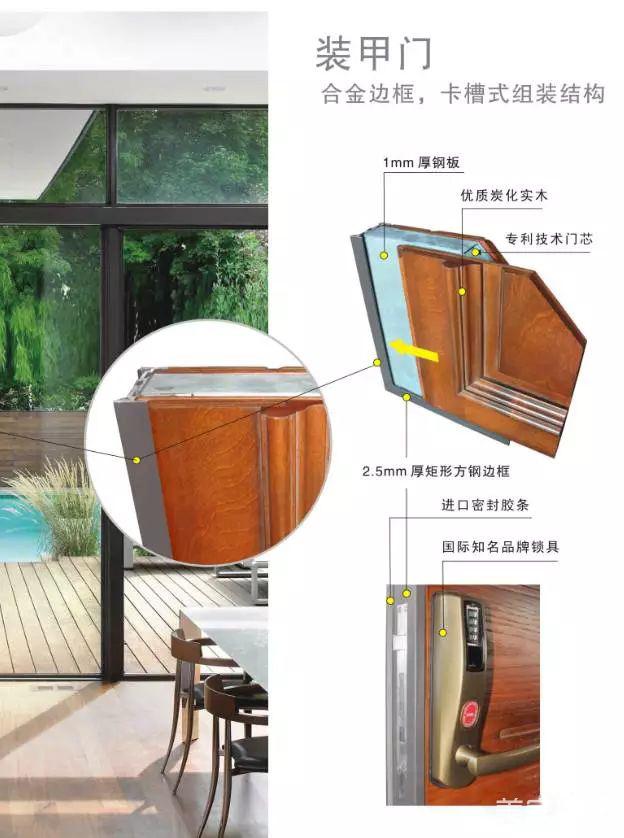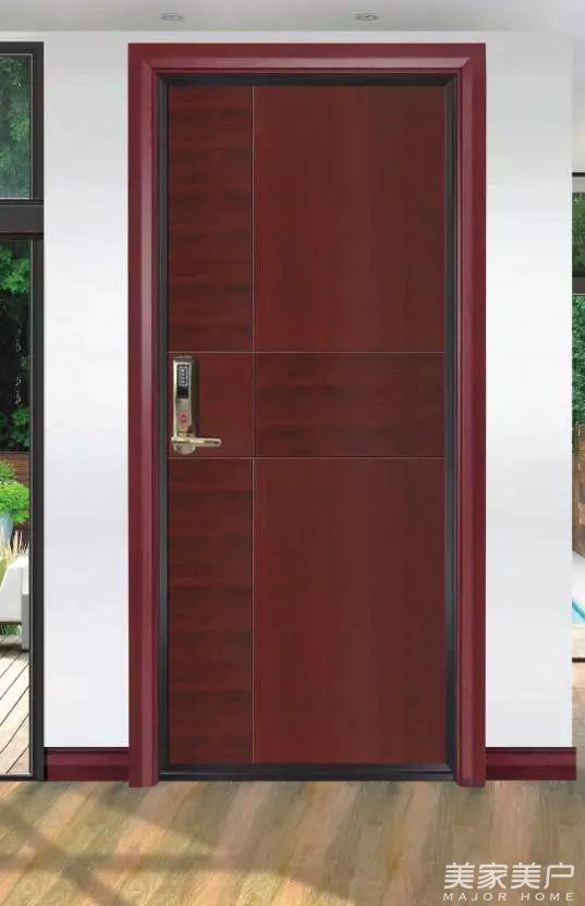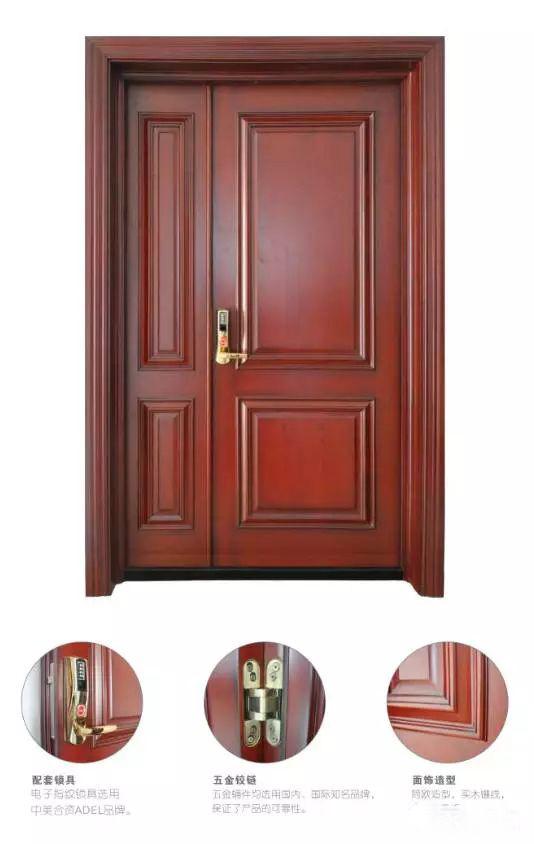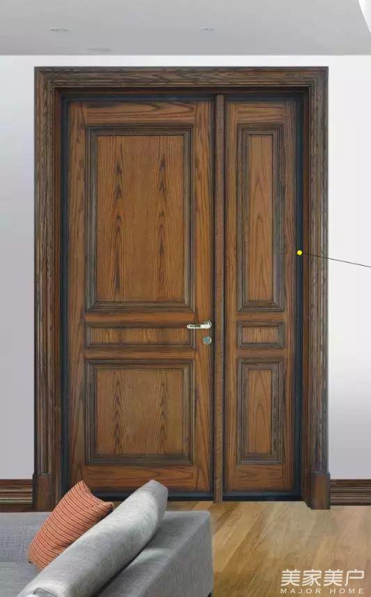 门扇采用钢龙骨,内填填充物,形成完整的钢质防盗门结构,同时外侧包覆木制作