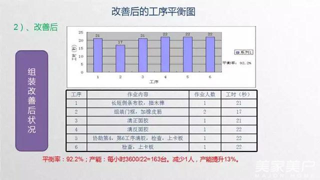 改善前平衡率80.5%,改善后92.2%,提高11.7%,产能由144台/小时提升至163台/小时,减少1人,提升13%。