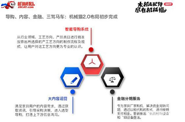 根据机械猫CEO及创始人黄唯2017年初的规划,今年12伦教展期间——上线的机械猫2.0版本,将会为家具采购商提供三大服务体系,具体为智能导购系统(帮助家具企业轻松找到所需产品)、大内容运营(让采购商预先了解企业评测与行业信息,更方便的去选购)、金融分期服务(分期付款,二手设备变现回租,解决家具制造业升级换代的问题),
