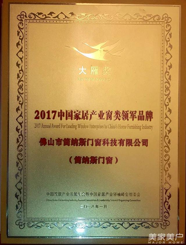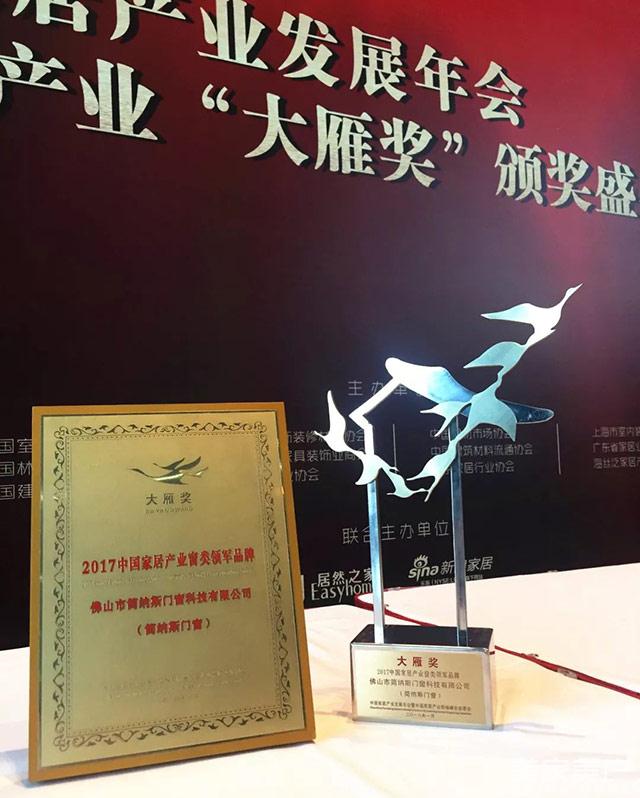 祝贺【简纳斯门窗】荣获2017年度“大雁奖”中国家居产业门窗领军品牌!