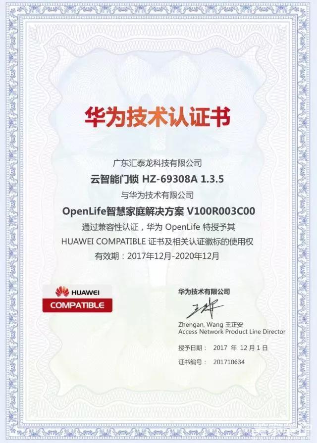 早在2016年汇泰龙便已成为华为OpenLife智慧家庭重要战略合作伙伴之一,并获得2016全联接大会最佳解决方案奖。2017年汇泰龙获得华为技术认证,代表着华为对汇泰龙产品质量、稳定性等方面的认可。