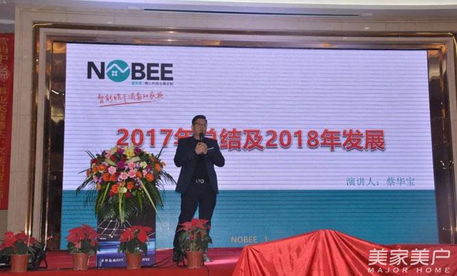 下面是我们的大家长:诺贝尼董事长蔡华宝先生,对大家做17年做整体总结与18年整体发展的报告。特别指出17年作为创新元年,我们完成产品优化、客户优化与流程再造的工作,同时定义2018年为公司品牌元年,并从营销、信息化、人才等方面做了整体规划。