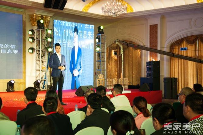 皇庭门业提出要做全屋定制,皇庭集团开发设计总监朱发兵先生上台对皇庭集团整装设计理念发布作讲解,主要从家具的材质及木作生产、家具尺寸、材质、工艺细节、木饰面与金银箔的表面漆工艺、家具后期维护与保养四个方面进行分享。同时指出要做好整装,需要做好经销商和厂商的对接工作。