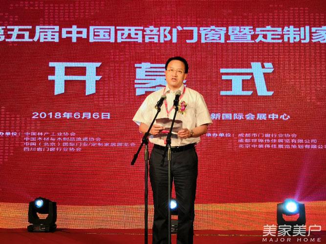 中国木材与木制品流通协会刘能文会长致辞,刘会长表示现在行业发展形势迅猛,西部门窗暨定制家居展会商机多多,日后协会将与各协会、企业一起努力,共同为行业与展会的发展多出一份力!