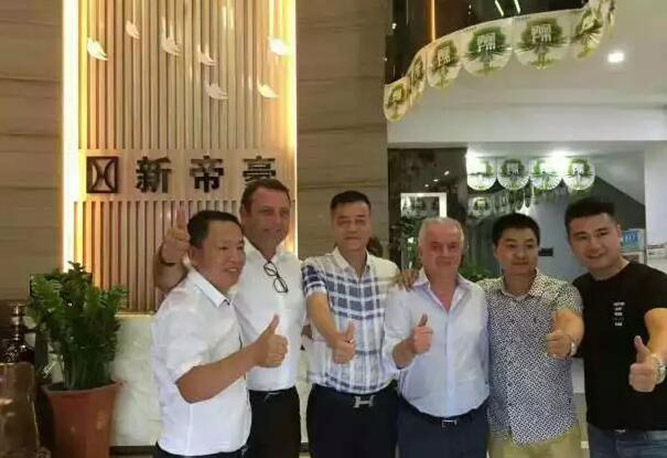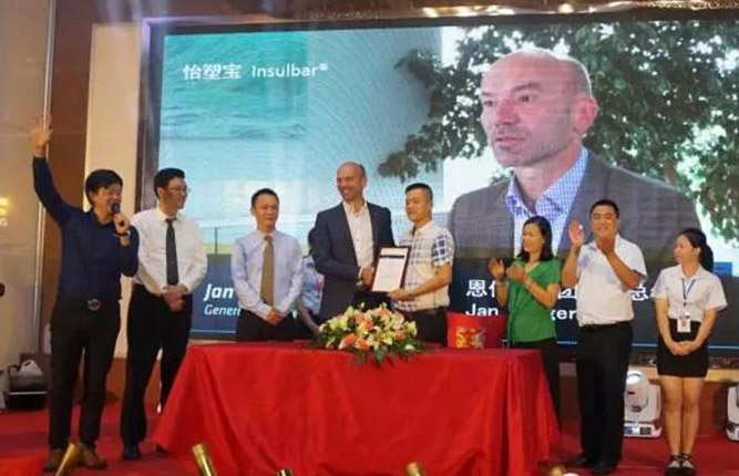 在7月7日晚会上,怡塑宝集团全球总裁担各先生(钟董旁)、中国区总经理卫浩文先生(上图左二)、华南区经理李冰中先生(上图左三)亲临现场与钟董签约。签字完后,担各总裁还向全场发表演讲,他很感谢钟董的招待,感谢中国朋友的热情,同时他也介绍了怡塑宝全球领先的技术优势,(卫浩文先生在旁翻译)。担各先生的演讲博得了全场朋友的一片掌声。