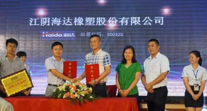 在晚会上,继德国舒德梅特、德国怡塑宝后,新帝豪与江阴海达股份签订战略合作协议,海达股份建筑事业部广东分公司总经理张文进(左二)先生、李凯经理(左一)作为海达代表出席了签约仪式。