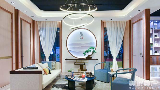 展厅内部以南北纵轴对称布置,重点展出梦天水漆全屋•轻奢系列新品及梦天水漆木门新品,植入现代、新中式元素,空间相互辉映,尽显轻奢精致之美。