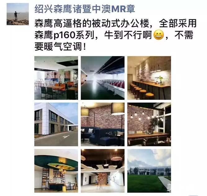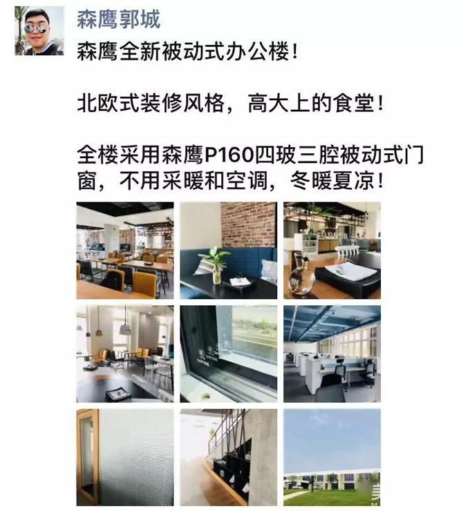 森鹰的办公楼不但极美,而且还是被动式建筑。被动式建筑是不需要采暖与制冷等主动能源,只依靠太阳能、电器和人体发热等被动能源就可以达到舒适的温湿度需求的建筑,与普通建筑相比,它可以节省90%的能量。森鹰被动式工厂斥资1.5个亿,历时6年精心打造而成,是世界上面积最大的被动式工厂,已通过德国PHI认证。办公楼的窗户采用超级密封的森鹰P160(Uw值低于0.6),配以六道过滤的新风系统,在耗能最低的情况下,冬暖夏凉,空气清新,为森鹰人提供无比舒适的办公环境,完美诠释了森鹰“极限降耗,极美生活”的使命。