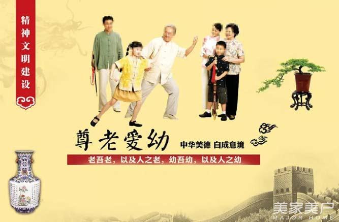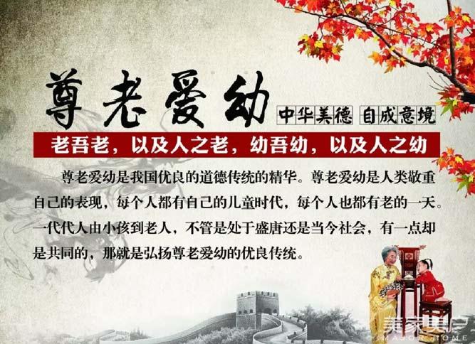 尊老爱幼是中华民族的传统美德,流传数千年。孟子说:“老吾老,以及人之老,幼吾幼,以及人之幼。天下可运于掌。”其意为:“敬重自己的长辈,进而尊重他人的长辈,呵护自己的子女,进而爱护他人的子女。若能如是,国泰民安的理想就如掌中之物般容易实现。”因为每个人都有自己的孩童时代,也都有衰老的一天。与此同时,尊老爱幼又是一种社会责任。因为尊老爱幼是保证家庭的和睦幸福的保障。而家庭又是构成人类社会的细胞。和睦家庭是和谐社会的基础。