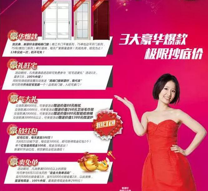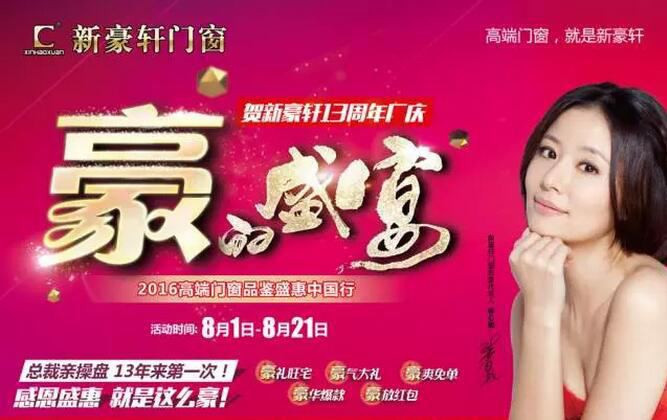 本次活动,公司将结合13年来最劲爆的价格和完美的产品配套组合方案,来感恩回馈广大消费者!更多惊喜,敬请广大消费者前往当地新豪轩门窗专卖店体验!