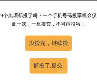 再次确认投票。第一次提交后发现少投或投错,可以在这里返回修改,确认后最终提交,投票完成