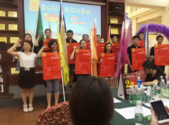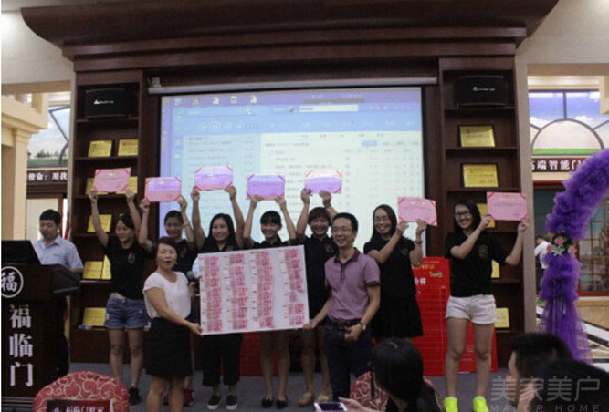 福临门智能门窗(也名福临门世家)工厂总部现场气氛热烈,经销商们刚结束一场互动游戏,纷纷喊“热到不行”。从福临门智能门窗总经理董总口中得知,该游戏是企业工厂开放日万人团购盛宴誓师会的其中一个项目,本次共有百余位经销商齐聚一堂,为即将在8月21日开展的以“匠心12载,邀您同鉴证”为主题的万人团购活动做动员和准备工作。
