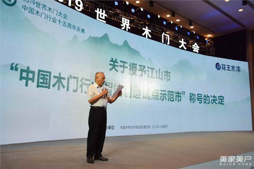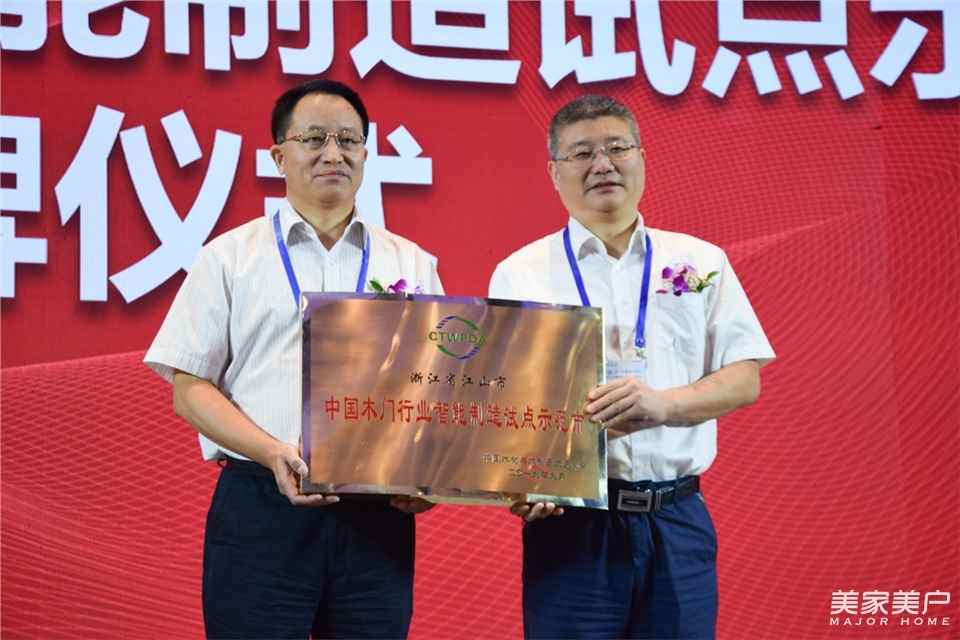 中国木材与木制品流通协会副会长兼秘书长李佳峰先生宣读授牌决定:授予江山市人民政府“中国木门行业智能制造试点示范市”称号。中国木材与木制品流通协会会长刘能文先生为江山市人民政府颁发“中国木门行业智能制造试点示范市”牌匾。